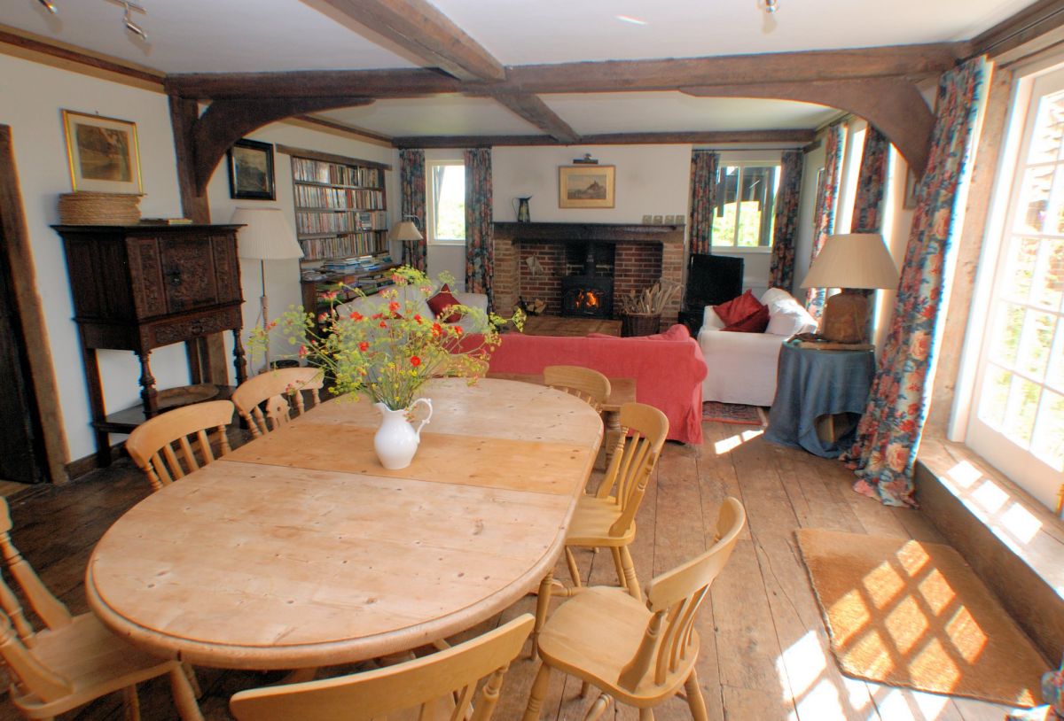 The house has five bedrooms, a magnificent beamed living room with wood-burning stove, and three bathrooms.